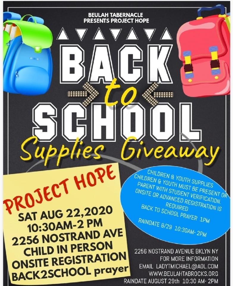 We are aiding families in the Flatbush area of Brooklyn that are in need of food and back to school supplies for their children. Our event is set for Saturday, August 22, 2020 (Rain date: Saturday, August 29, 2020). Please help us by donating school supplies! We’ve created two wish lists of items through Target and Amazon. Please click the link and it will direct you to the wish list. You can purchase an item(s) you would like to donate. Target Registry & Amazon Registry . If you wish to make a monetary contribution, please SCashApp: Beulah Tabernacle Church at $BeulahTabRocks or Pay Pal- Beulah Tabernacle Church. Monetary donations will be used to purchase items on the list or to purchase fabric masks for each child. Donations are not tax deductible. Please have all items delivered by August 15th, which will allow us time to pack 200 bags for elementary, junior high and high school students!